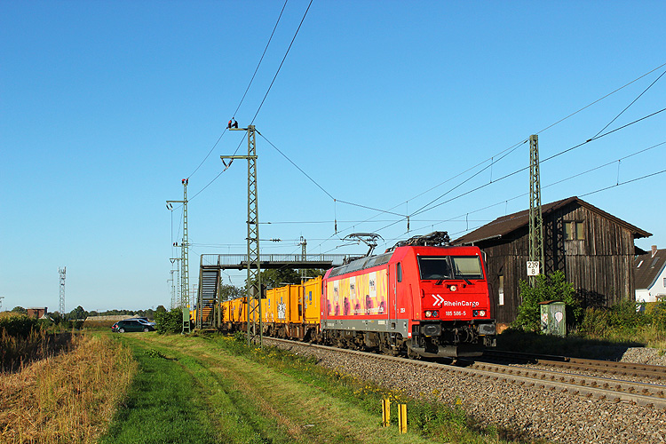 Danach wollte ich es einmal weiter südlich bei Efringen-Kirchen versuchen. Leider fährt hier der größere Teil der Züge über eine parallel verlaufende, unfotogene Neubaustrecke. Auf der Altstrecke bekam ich BLS-Cargo 485 011 mit einem "Cargo-Beamer" von Freiburg nach Novara vor die Linse, im Volksmund "rollende Landstraße" genannt. |