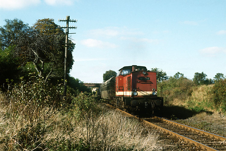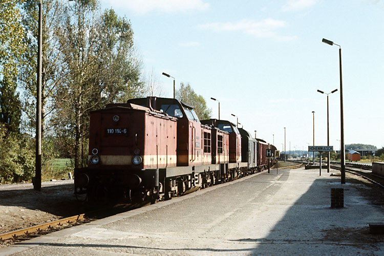 Der eigentliche Grund meiner Tour war der N 62724 Stendal - Salzwedel, der aber an diesem Tag statt mit einer 50 mit einem 110 - Pärchen daher kam - 110 114 + 110 229 Bw Salzwedel im Bahnhof Hohenwulsch, 04.10.1986. |