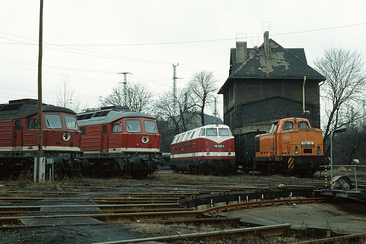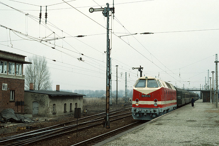 Danach machte ich mich mit dem E 545 Berlin - Stendal auf die Heimreise. Beim Lokwechsel im Bahnhof Wustermark gelang mir noch dieses Bild von der Oebisfelder 119 004, die den Zug soeben von einer 211 übernommen hat, 27.01.1991. |