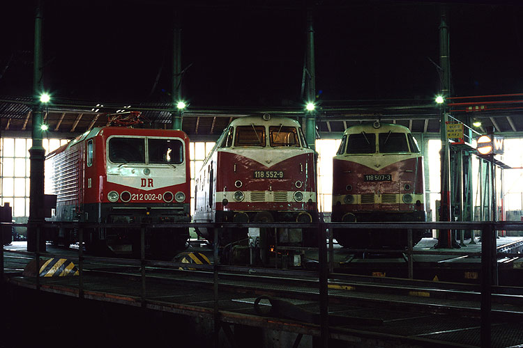 Am nächsten Morgen stand die Einsatzstelle Rummelsburg des Bw Ostbahnhof auf dem Programm. Im Rundschuppen war ebenfalls eine ehemalige Regierungszuglok zu sehen, 118 552 - flankiert von 212 002 und 118 507, 27.01.1991. |