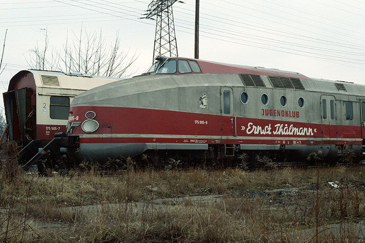 Im Freigelände stand der "Jugendklub Ernst Thälmann" alias 175 005 / 006 abgestellt. Dieser Schnelltriebwagen der Bauart Görlitz wurde nach seinem Ausscheiden aus dem Plandienst zur Unterhaltung der jugendlichen Eisenbahner bei der Elektrifizierung auf den oft abgeschiedenen Einsatzorten im Norden der DDR umgebaut. |