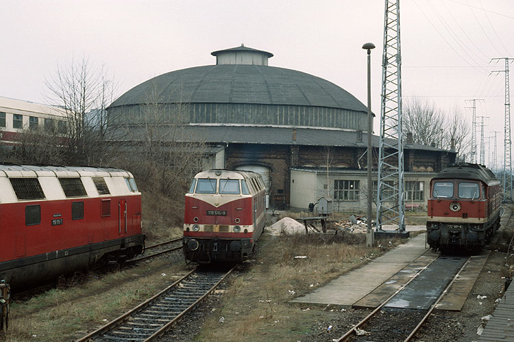 Zum Abschluß noch eine Aufnahme vor dem Rummelsburger Rundhaus, 118 119, 118 514 und 132 501, 27.01.1990. |