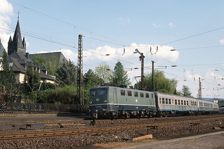 Bei einer Sonderfahrt 1991 an den Rhein staunte ich über die vielen dort noch fahrenden grünen Elloks. So machte ich auch diese Aufnahme von 141 095 mit dem rheinabwärts fahrenden N 6128, Oberlahnstein am 21.04.1991. |