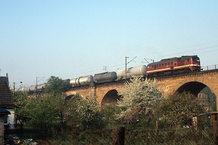 Über das Viadukt in Leipzig - Wahren brummte am 06.05.1992 die Wahrener 220 041 mit einem Kesselzug. |