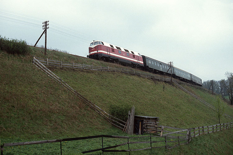228 764 vom Bw Leipzig Süd rollt bei Wolfsgefährt mit dem P 3034 Saalfeld - Leipzig talwärts, 07.05.1992. |