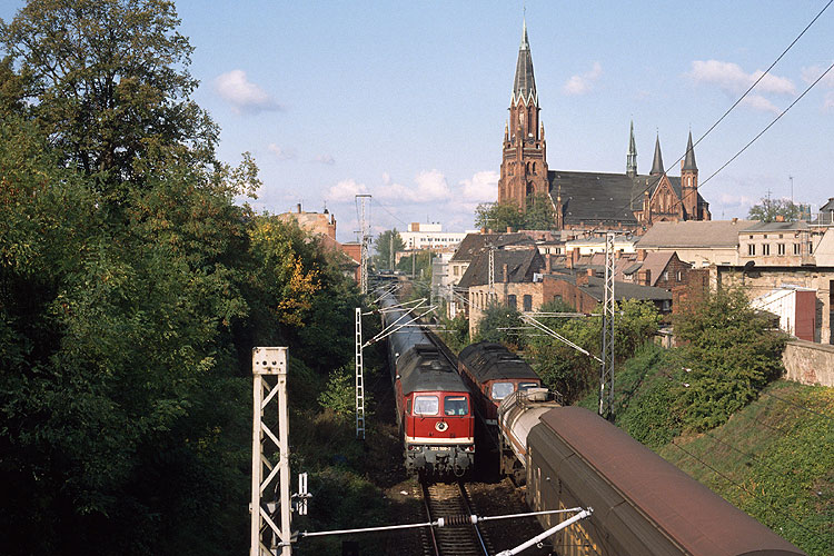 Vor der Kulisse des Schweriner Dom's begegnen sich 232 508 mit dem IC 638 Binz - Köln und eine weitere 232 mit einem nordwärts fahrenden Güterzug, 03.10.1992. |