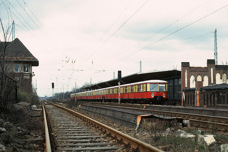 Zum Abschluß nun noch die Berliner S-Bahn - ein gut gepflegter Zug fährt zum Wenden aus dem Bahnhof Friedrichshagen aus, 02.04.1994. |