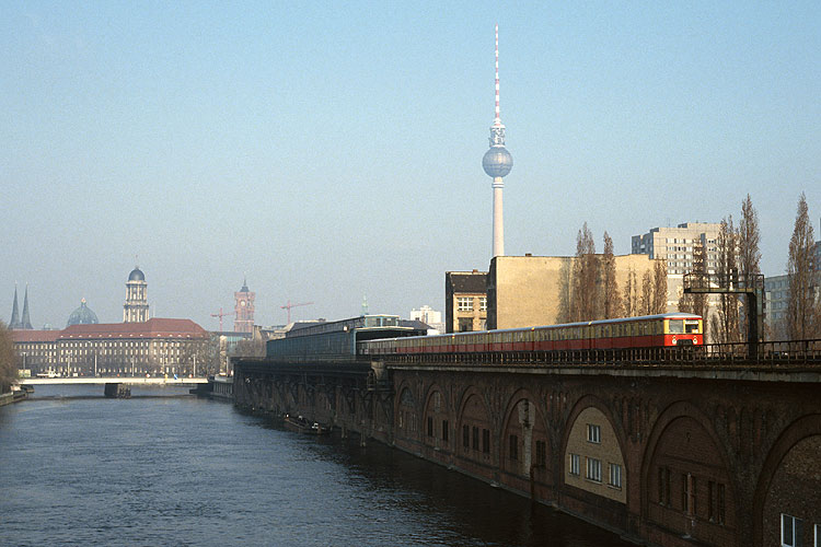 Vor der prächtigen Ost - Berliner Stadtkulisse hat ein Zug nach Strausberg den Bahnhof Jannowitzbrücke verlassen, 03.04.1994. Dieses war nun die endgültig letzte historische Galerie, als nächstes werde ich die Strecke Wittenberge - Magdeburg mit aktuellen Aufnahmen in Angriff nehmen. |