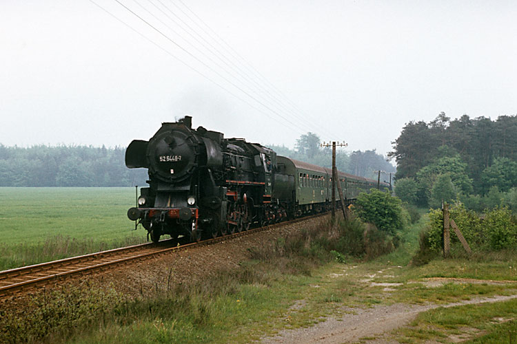 Neben den Museumslok's der Reichsbahn kamen oft auch Planloks bei den Dampfsonderfahrten des Modellbahnverbandes zum Einsatz. Am 15.05.1983 machten die Hallenser eine Rundfahrt von Dessau über Wittenberg und Eilenburg zurück nach Dessau. Dabei kam auch die Falkenberger 52 5448 zum Zuge, aufgenommen bei Söllichau an der Strecke Wittenberg - Eilenburg. |
