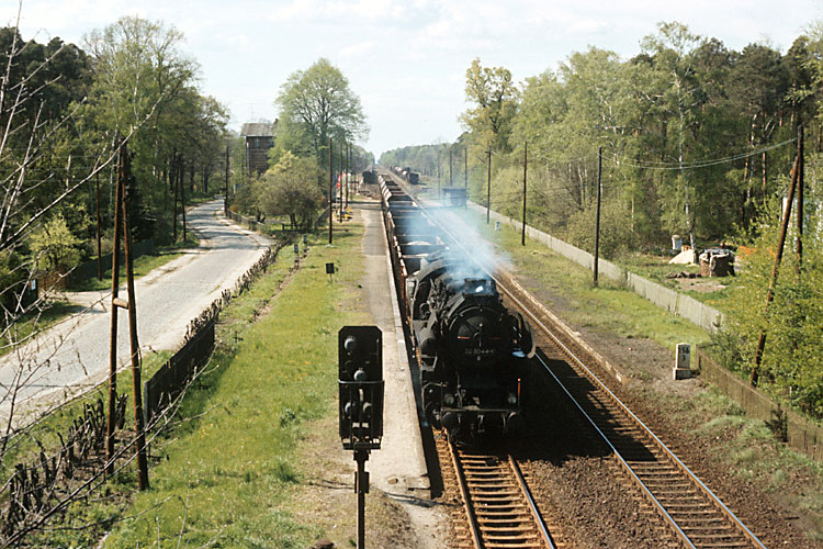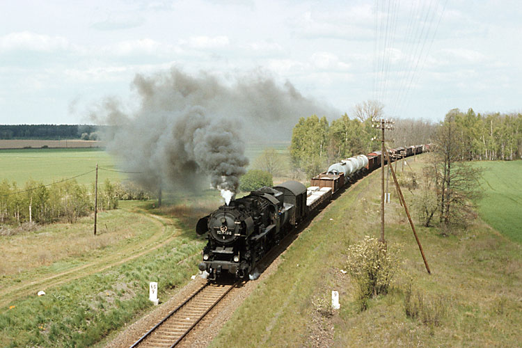 Danach war erst einmal Zeit für eine ausgiebige Mittagspause, denn 52 8025 hatte in Jüterbog mehr als zwei Stunden Wendezeit und andere Dampfzüge gab es zu jener Zeit in der näheren Umgebung nicht mehr. So wartete ich hinter Jüterbog, bis die Lok mit der Rückleistung N 60179 nach Falkenberg gefahren kam. |