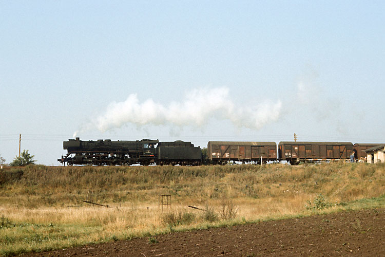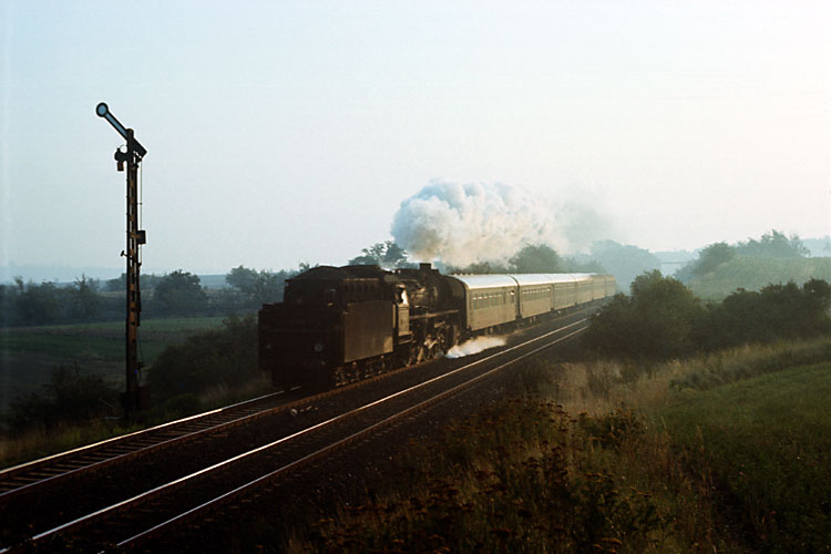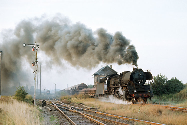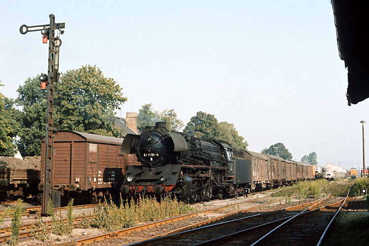 Weiter geht es für 41 1150 mit dem Dg 54751, er passiert den Posten 13 zwischen Förderstedt und Staßfurt, 03.10.1987. Zu dieser Zeit war der Einsatz der Baureihe 41 bei der Deutschen Reichsbahn so gut wie beendet, bestenfalls eine Lok pro Tag lief von der Einsatzstelle Staßfurt aus noch im Zugdienst. |