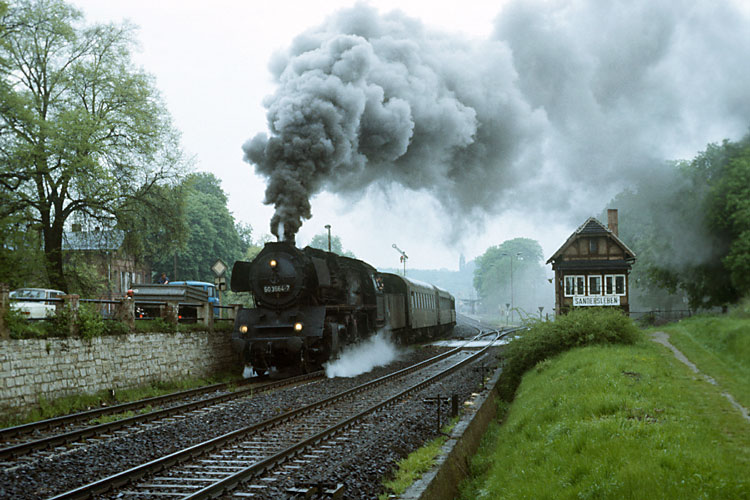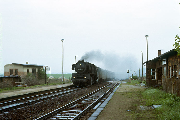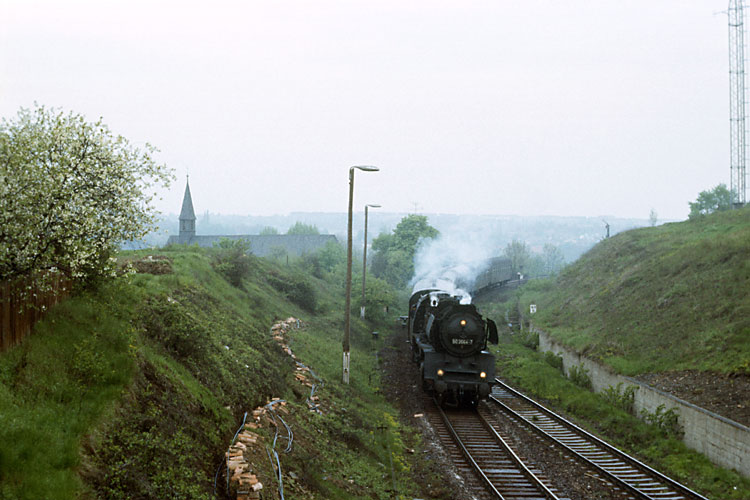 Am 10.05.1986 sprang 50 3564 für eine ausgefallene 41 ein und brachte den P 3223 nach Sangerhausen, hier die Ausfahrt Sandersleben. |