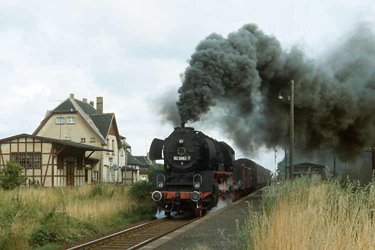 50 3682 dampft mit der Üb 71757 Staßfurt - Güsten durch den Haltepunkt Neundorf, 26.07.1987. |