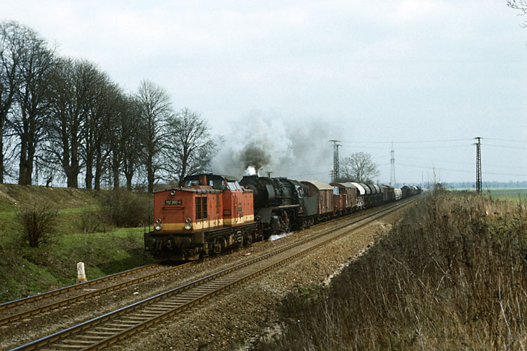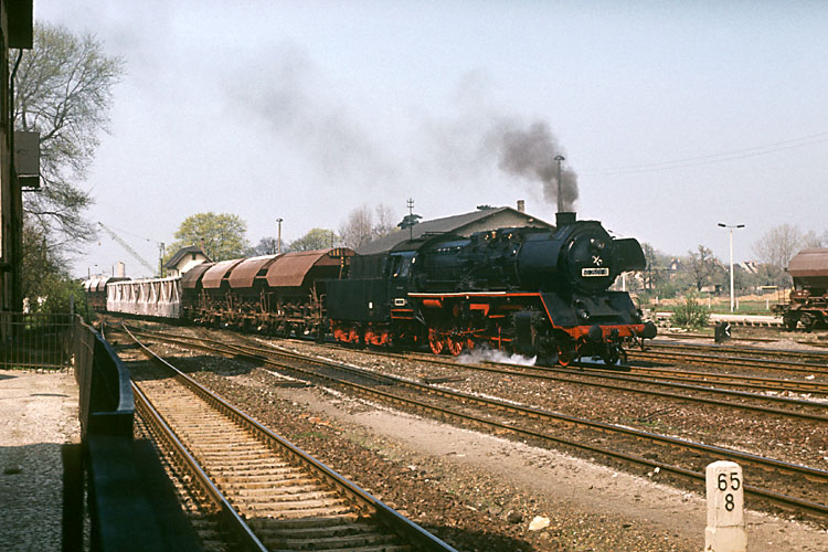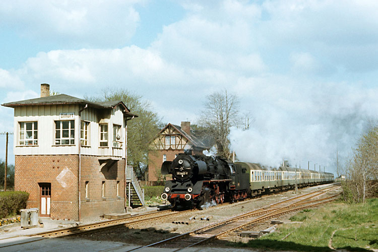 Im Frühjahr 1988 war als letzte noch 50 3662 beim Bw Halberstadt im Einsatz, hier durchfährt sie mit dem P 19408 (Berlin) - Halberstadt - Thale den Bahnhof Wegeleben, 09.04.1988. Der P 19408 lief als sogenannter "beschleunigter Personenzug" und hielt nur in Quedlinburg. Bis Halberstadt liefen die Wagen im D 640 Berlin - Wernigerode mit, dort wurde der Zug geteilt. |