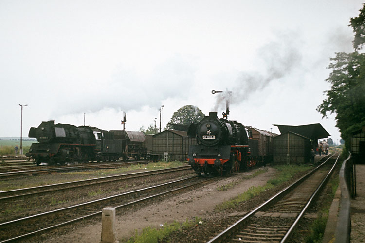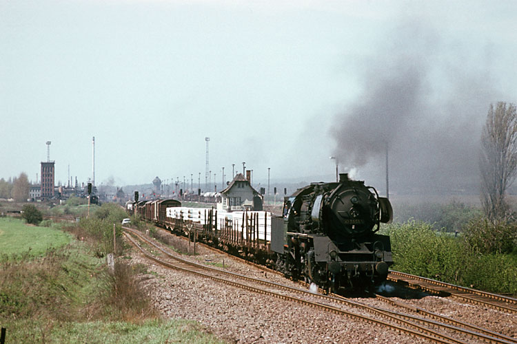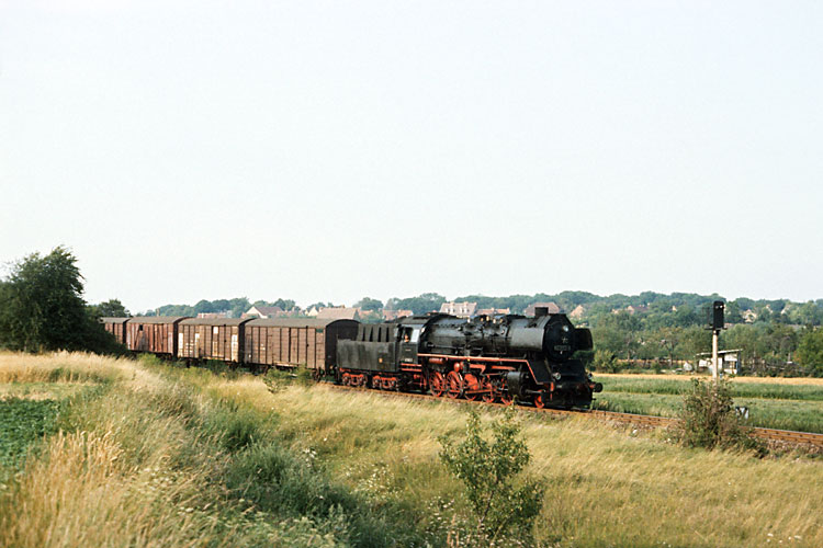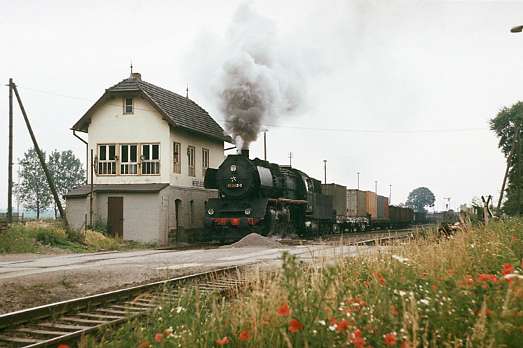 Am 28.08.1984 hatte 50 3700 den P 19408 am Haken, sie hat soeben Wegeleben durchfahren. Das Zugpaar P 19408 / P 19413 war das einzige planmäßig dampfbespannte bei der DR, das reinrassig in den damals neuen Farben des DR - Schnellverkehrs grün / beige verkehrte. |
