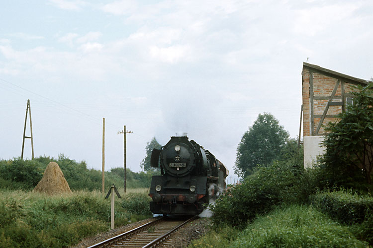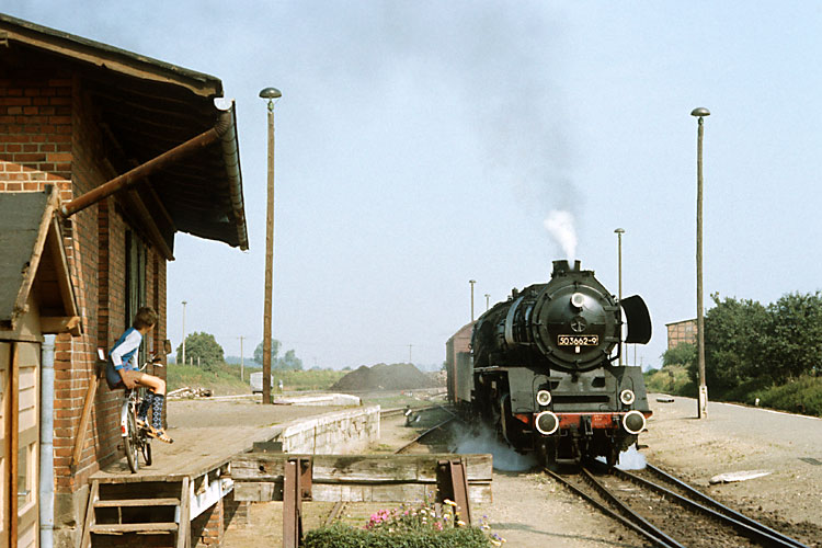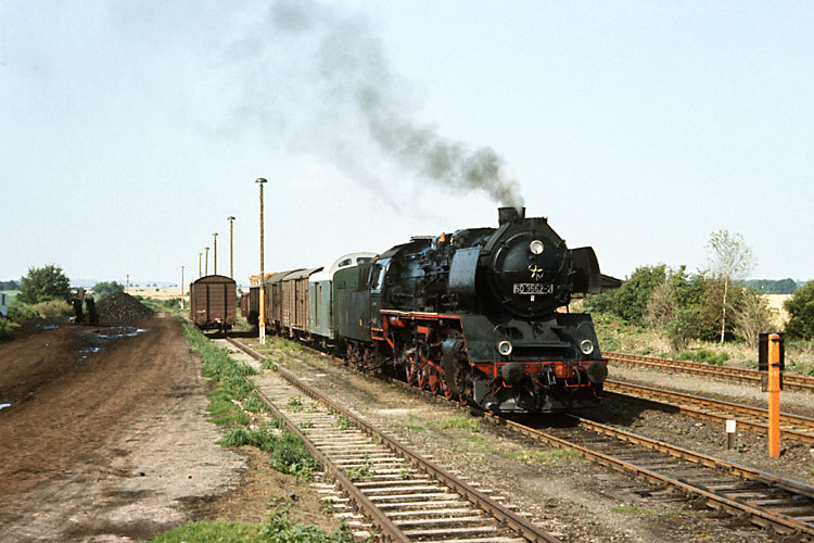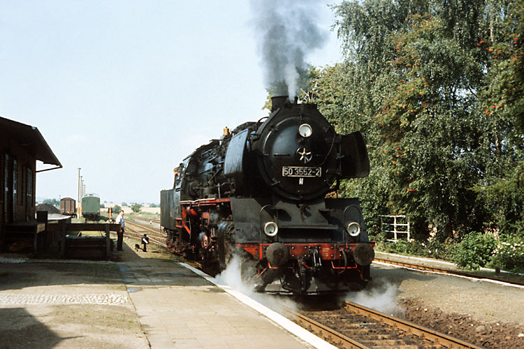 Nur bei Bedarf wurde im Güterverkehr bis zum Endbahnhof Dedeleben gefahren, meist wendete das Güterzugpaar in Badersleben. Am 23.08.1987 war Bedarf und 50 3552 durchfährt mit einem Wagen als Üa 74700 Vogelsdorf. |