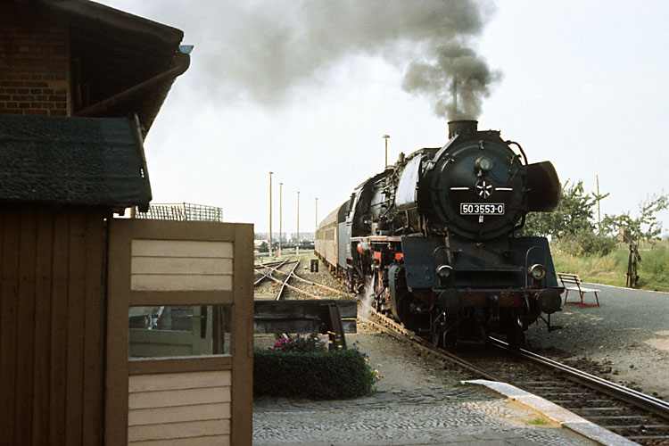 Nur werktags konnte man in den Achtzigern die 50er auf der Dedelebener Strecke auch im Reisezugdienst erleben, hier steht 50 3553 mit dem P 15434 nach Halberstadt im Bahnhof Dedeleben abfahrbereit, 01.09.1987. |