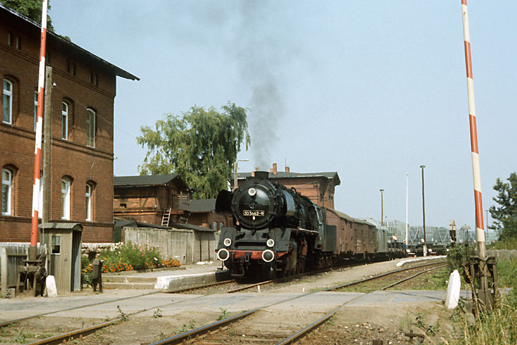 Der nun wieder abfahrbereite N 64784 mit 50 3552 im Bahnhof Eilenstedt, 20.08.1987. |
