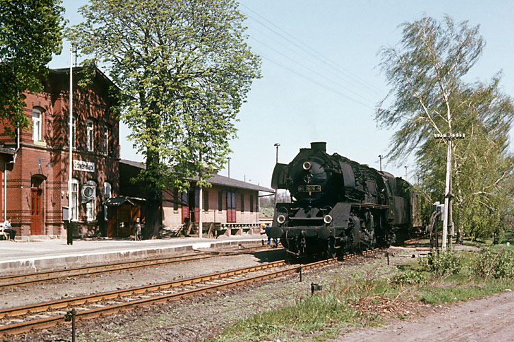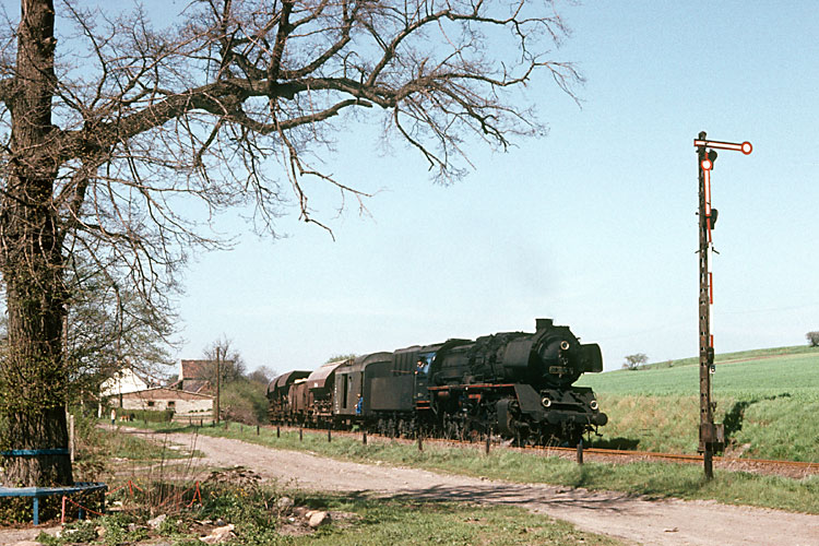 Der N 64784 mit 50 3606 hat den Bahnhof Schwanebeck erreicht, wo Rangierarbeiten anliegen, 29.04.1987. |