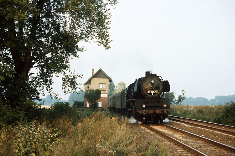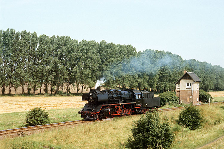 Beim Posten Emersleben handelte es sich um eine ehemalige Blockstelle, hier passiert 50 3553 mit dem P 15434 den zwischen Nienhagen und Groß Quenstedt gelegenen Posten, 01.09.1987. |