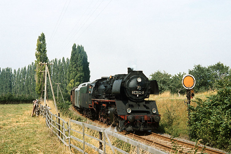 Der P 15434 fuhr ab Nienhagen auf der Hauptbahn bis Halberstadt weiter, 50 3553 am Posten Emersleben, 20.08.1987. |