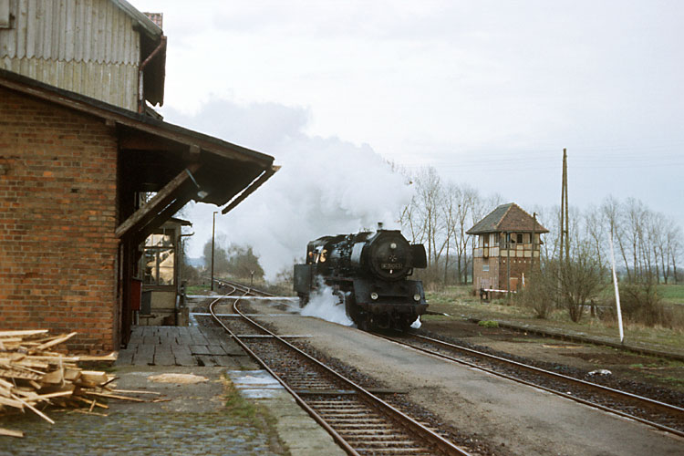 Auch am 09.04.1988 brachte 50 3606 den Gmp 68728 nach Gunsleben, hier steht sie mit dem Zug im Bahnhof Oschersleben abfahrbereit. |