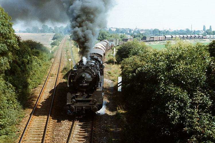 50 3559 hat mit dem N 61744 Magdeburg - Oschersleben den Rangierbahnhof Buckau verlassen und fädelt gerade am Abzweig Wolfsfelde auf die Halberstädter Strecke ein, 28.08.1985. |