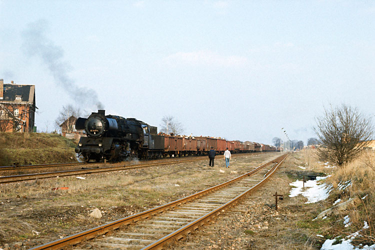 Der N 61748 Magdeburg - Oschersleben mit 50 3631 muß hingegen im Bahnhof Dodendorf eine Kreuzung abwarten, 13.04.1986. |