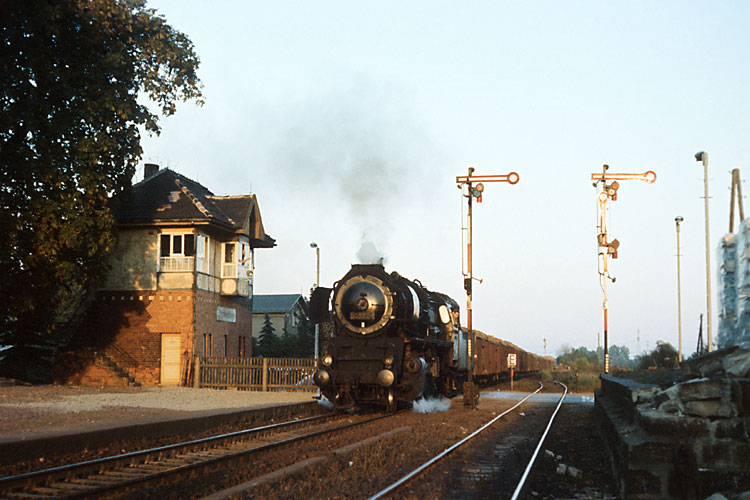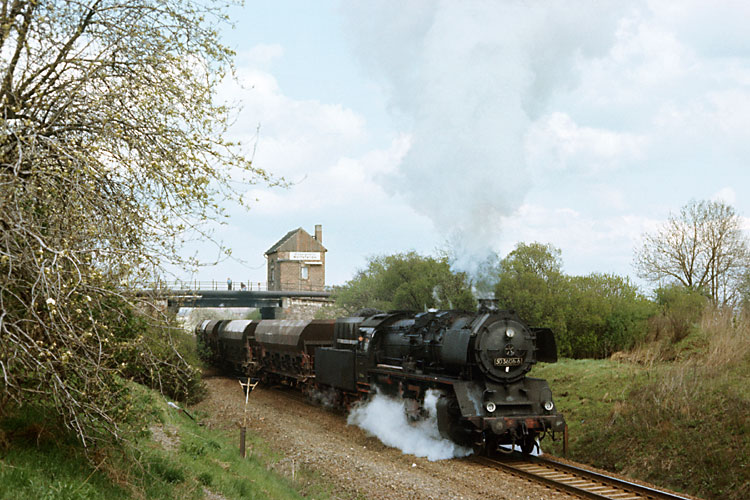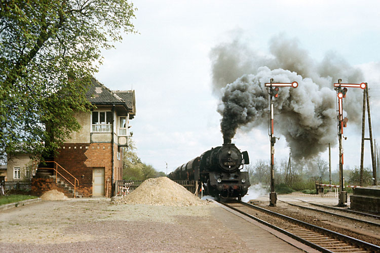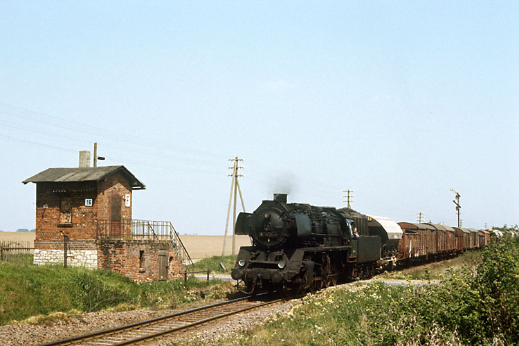 Der mit 50 3606 bespannte N 61746 passiert das Stellwerk an der östlichen Einfahrt von Langenweddingen, 23.04.1988. Auf diesem Bahnübergang stieß einst eine Halberstädter 22 vor einem Personenzug nach Thale mit einem mit Benzin beladenen Tanklaster zusammen und es kam so zu einem der schwersten Eisenbahnunfälle der DDR - Zeit mit vielen Toten. |