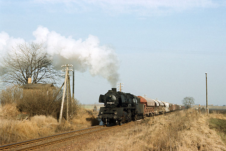 50 3662 verläßt mit dem N 61744 nach Oschersleben Dodendorf, 13.04.1986. |
