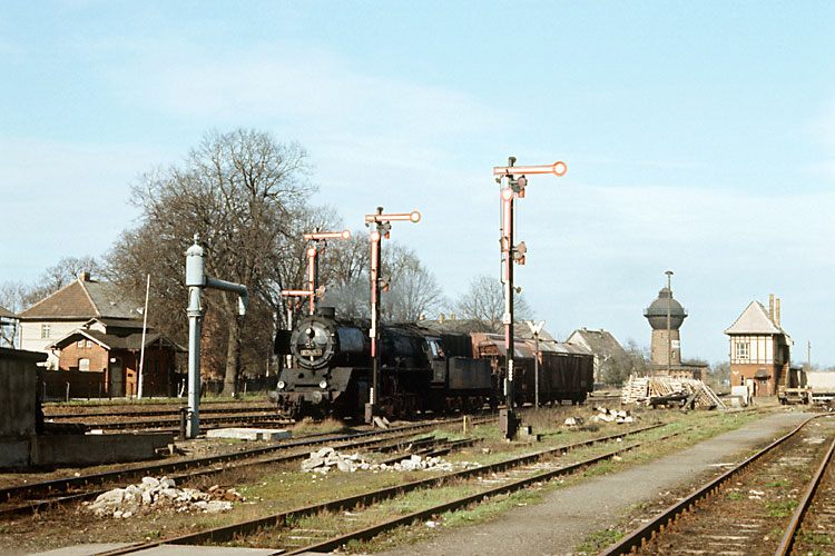 Auch am 10.04.1988 hatte der N 64774 Dodendorf - Blumenberg nur zwei Wagen und rollt mit 50 3606 in den sehenswerten Zielbahnhof ein. |