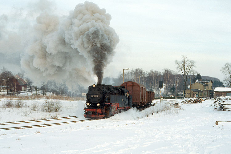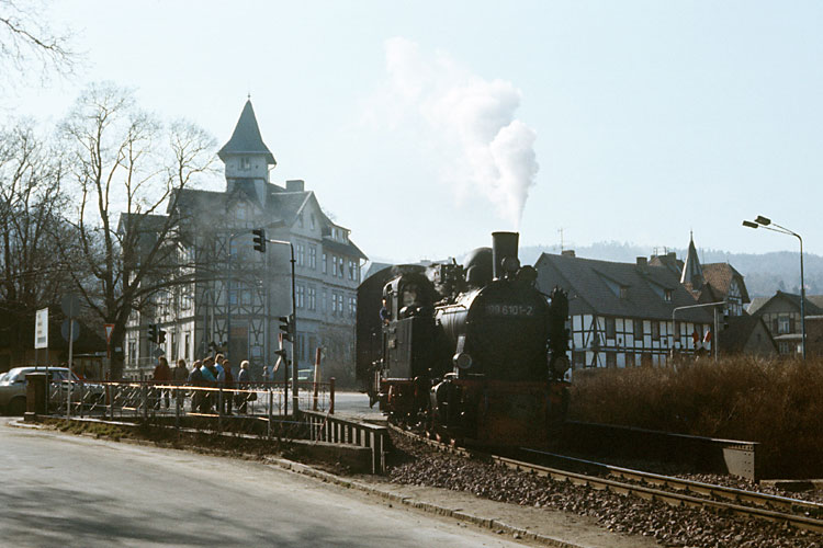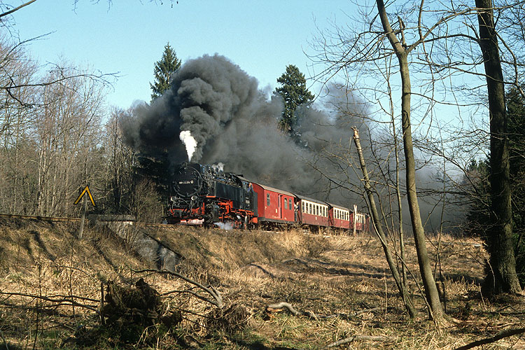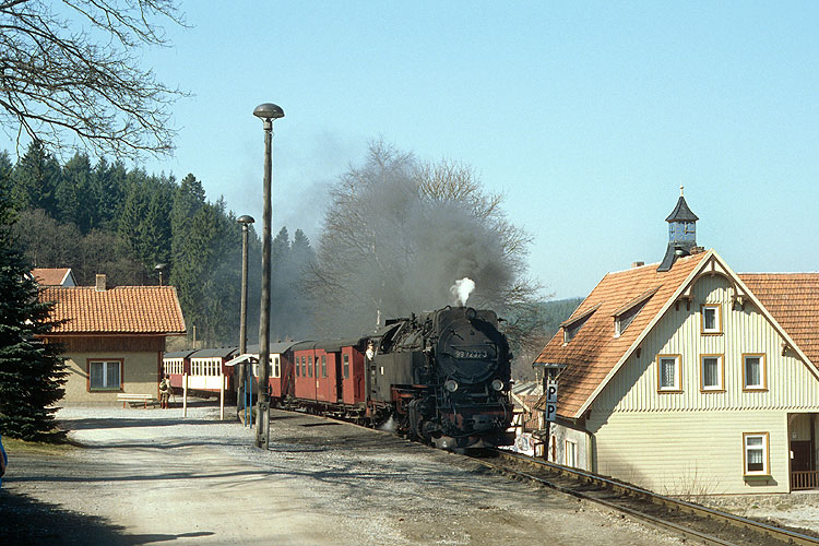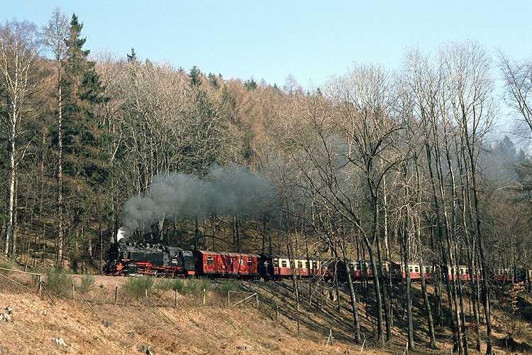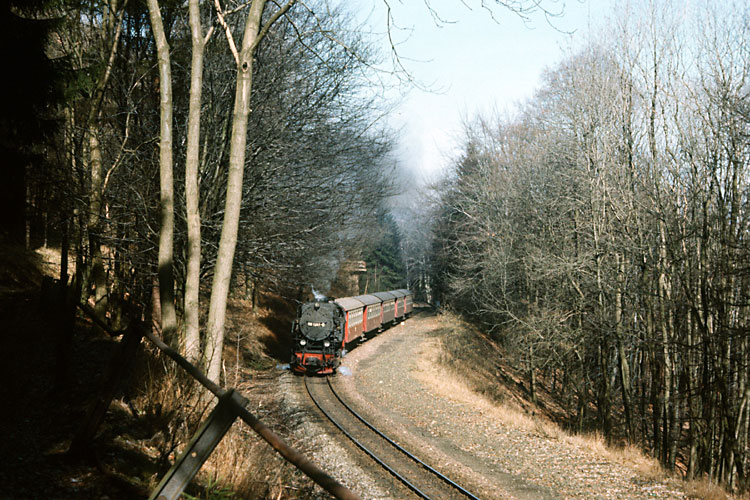 Am ehemaligen Kreuzungsbahnhof Drängetal konnte ich den Zug eine halbe Stunde später nochmals aufnehmen, 07.03.1989. Heute liegt hier wieder ein Ausweichgleis, durch die Wiederinbetriebnahme der Brockenbahn ist der Zugverkehr dichter als zu DDR-Zeiten. |