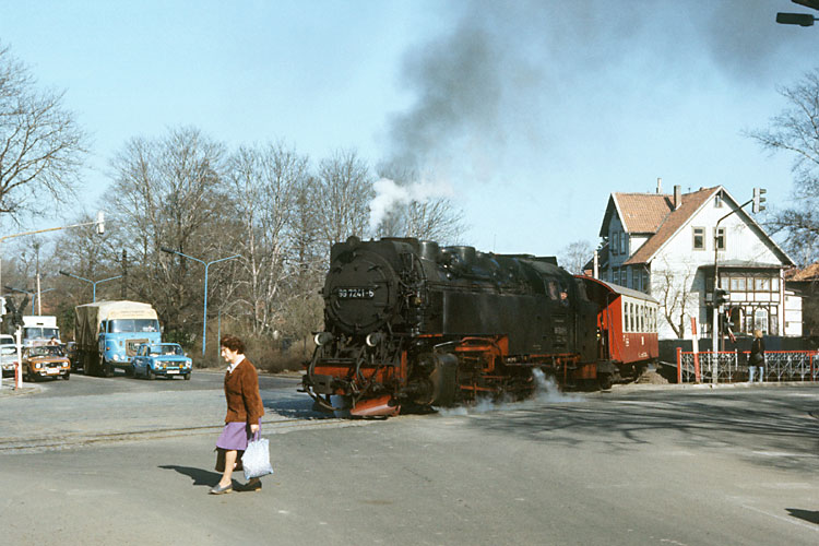 Am 17.02.1990 war ich wieder einmal an der Harzquerbahn unterwegs. Der Güterverkehr lief trotz des Mauerfalls noch auf der Schiene weiter, 99 7241 wird mit ihrem Rollbockzug sogleich den Bahnhof Wernigerode-Hasserode erreichen. |