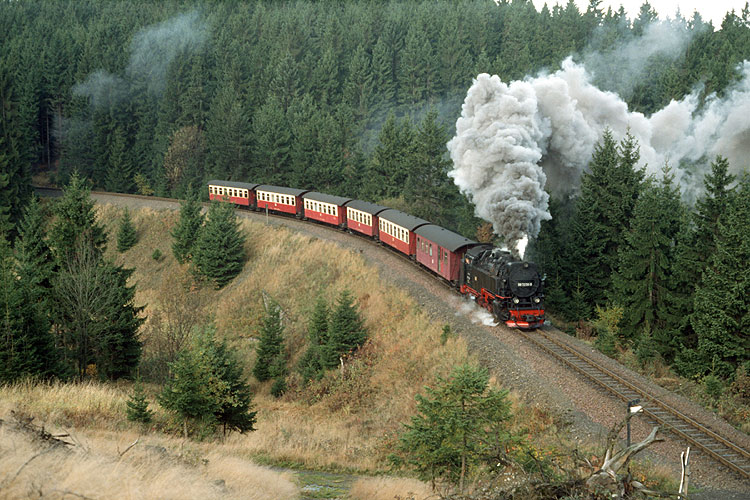 Die nächste Harztour unternahm ich im Herbst 1989 kurz vor den Ereignissen, die auch dieser dicht am Eisernen Vorhang liegenden Bahn viele Veränderungen bringen sollten. Noch war aber nichts davon zu spüren und das Erreichen der westlichen Ausfahrt des Bahnhofes Drei Annen Hohne mit dem Auto von der Laune der oft vor Ort weilenden Polizei abhängig. Am 14.10.1989 glückte mir dieses, als der Nahgüter 67771 nach Benneckenstein mit 99 7235 + 7237 angefahren kam. |