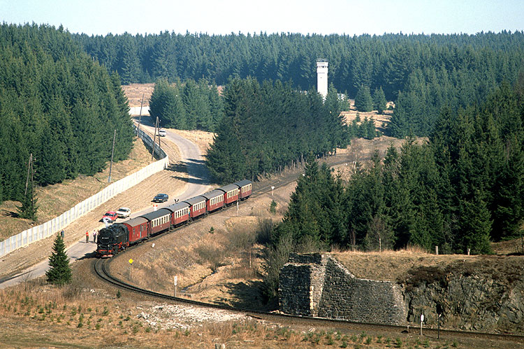 Nun konnte ich auch meine neue Freiheit nutzen und die noch wenige Monate zuvor unerreichbare Stelle bei Sorge aufnehmen, wo die Strecke am dichtesten am Eisernen Vorhang verlief. Der P 14405 mit 99 7234 wird gleich die Reste der Überführung der Südharzeisenbahn nach Braunlage / Walkenried passieren, über diese Brücke war 1947 der letzte Zug gefahren. |