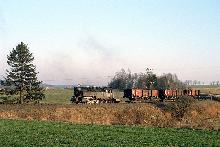 An der Waldbrandstelle zwischen Drängetal und Drei Annen dampft 99 7241 mit dem Abendzug P 14409 nach Nordhausen bergwärts, 04.04.1992. |