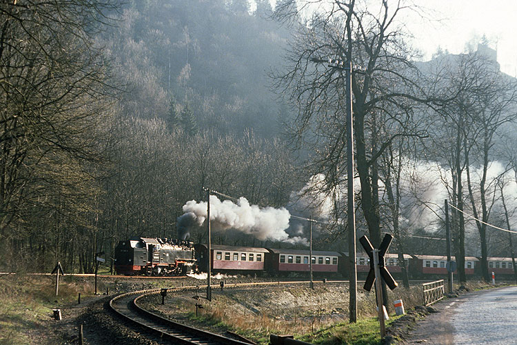 Auch 99 7246 ist hier auf dem Weg von Nordhausen nach Hasselfelde, mit dem P 14410 hat sie soeben den Bahnhof Eisfelder Talmühle verlassen, 31.03.1990. Das Gleis im Vordergrund ist die Wernigeröder Strecke. |