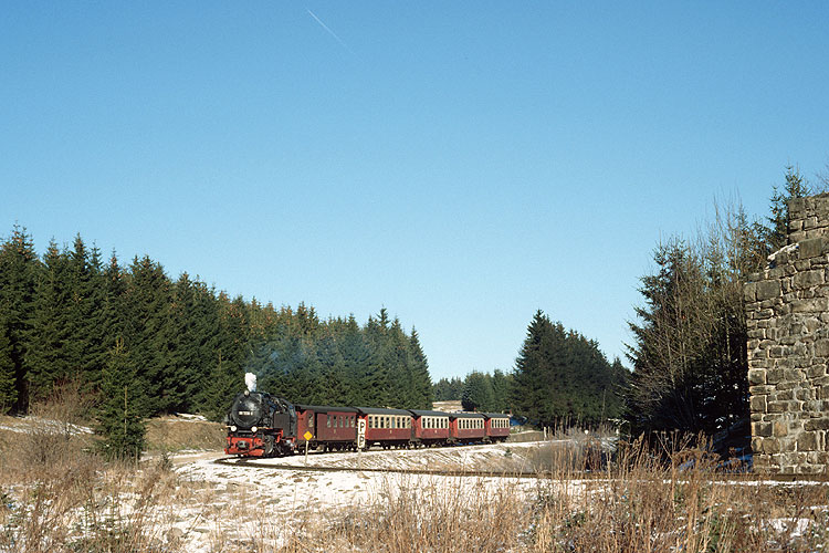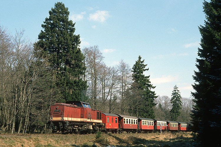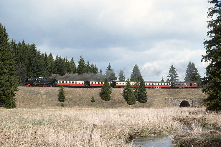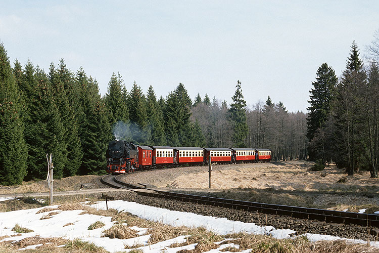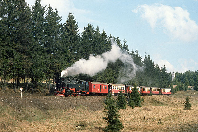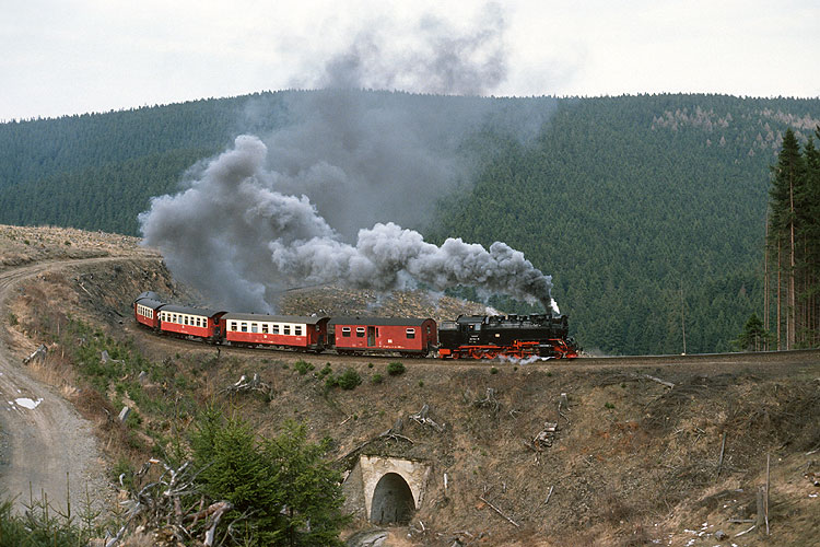 Im Wald bei Sorge ist hingegen 99 7239 mit dem Mittagszug P 14405 nach Nordhausen unterwegs, 11.04.1992. Vor der Wiederinbetriebnahme der Brockenbahn waren die durchgehenden Züge Wernigerode - Nordhausen und zurück Hauptbestandteil des Fahrplanes, vier Zugpaare verkehrten täglich. |