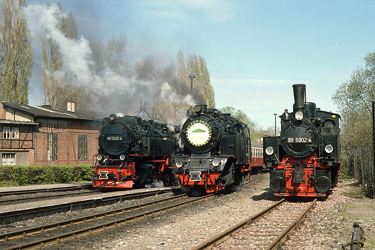 Wenig später herrschte Hochbetrieb im Brockenbahnhof, 199 891, 199 870 und 99 7241 hatten mit ihren Zügen alle Gleise belegt. |