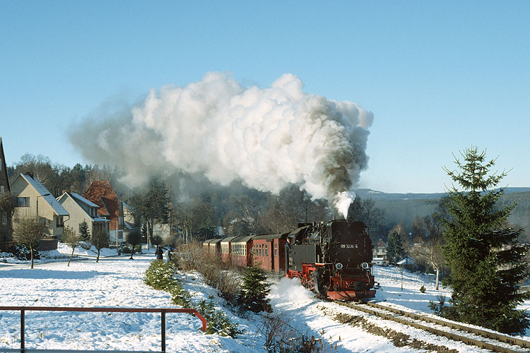 Einsätze des Traditionszuges von Wernigerode nach Benneckenstein und zurück finden in den Sommermonaten regelmäßig statt. Auch sonst ist der Zug zu allerlei Anlässen im Einsatz, gezogen meist von einer der Mallet-Lokomotiven. Am 28.07.1990 war 99 5902 im Rahmen der planmäßigen Einsätze Zuglok, aufgenommen bei der Ausfahrt aus Wernigerode-Westerntor. |