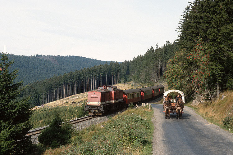 Nach der Wiedereröffnung der Brockenbahn hatten die Harzkamele ihre letzte große Blütezeit, da die Umweltschützer nicht so gern Dampfloks auf dem Brocken haben wollten. 199 870 ist hier mit dem P 8932 auf der Rückfahrt vom Brocken und wird bald den Bahnhof Schierke erreichen, dem Pferdegespann stehen dagegen auf der Brockenstraße die größten Steigungen noch bevor, 19.09.1992. |