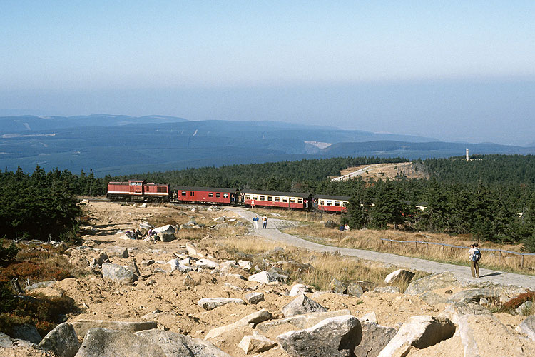 Eine Woche später war ich nochmals auf dem Brocken, 199 870 passiert mit einem bergwärts fahrenden Zug die Stelle, wo einst die Strecke mittels Tor die Brockenmauer durchquerte, 27.09.1992. |