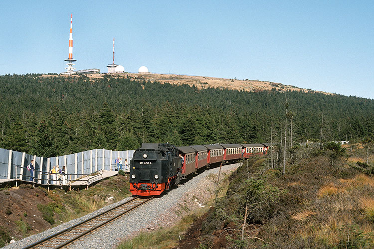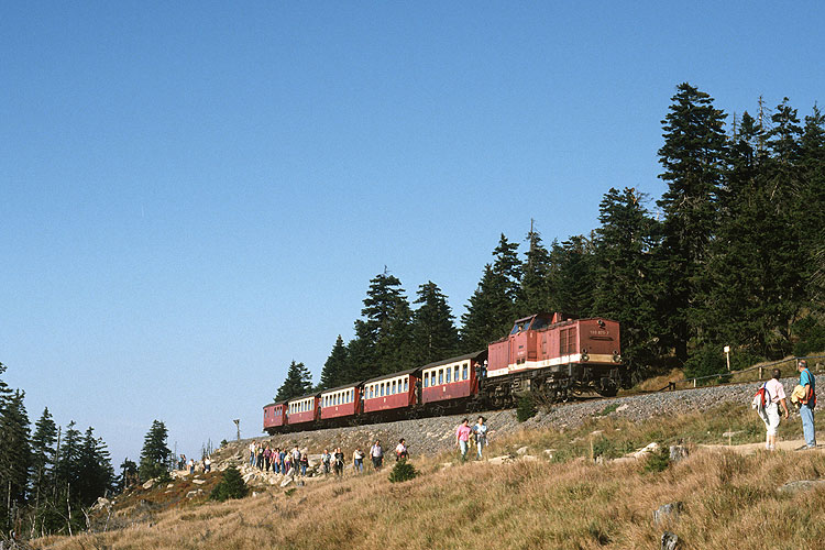 Am 15.09.1991 war es endlich soweit, die Brockenbahn wurde wieder für den öffentlichen Personenverkehr in Betrieb genommen. Menschenmassen bevölkerten das Brockenplateau und feierten ausgiebig dieses denkwürdige Ereignis. Zwei Sonderzüge fuhren als erstes auf den Brocken, hier Zug 2 mit 99 7244 und links Vorspannlok 99 5902. |