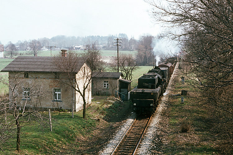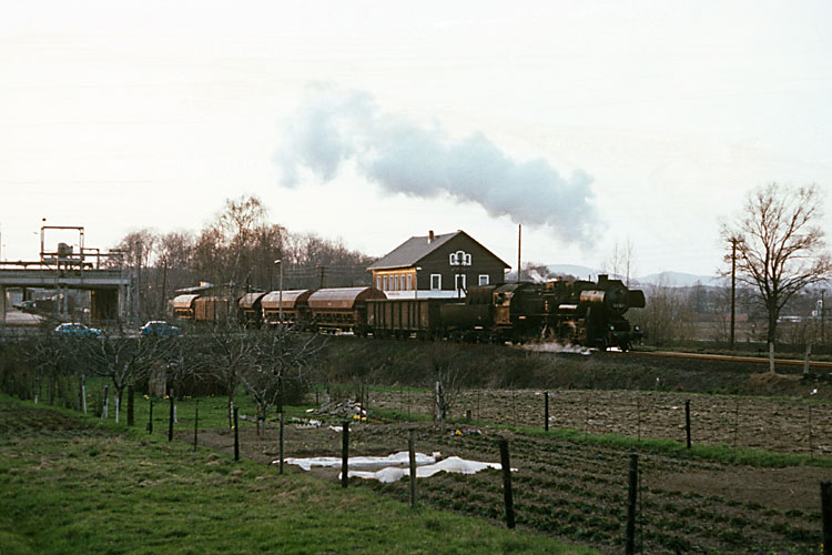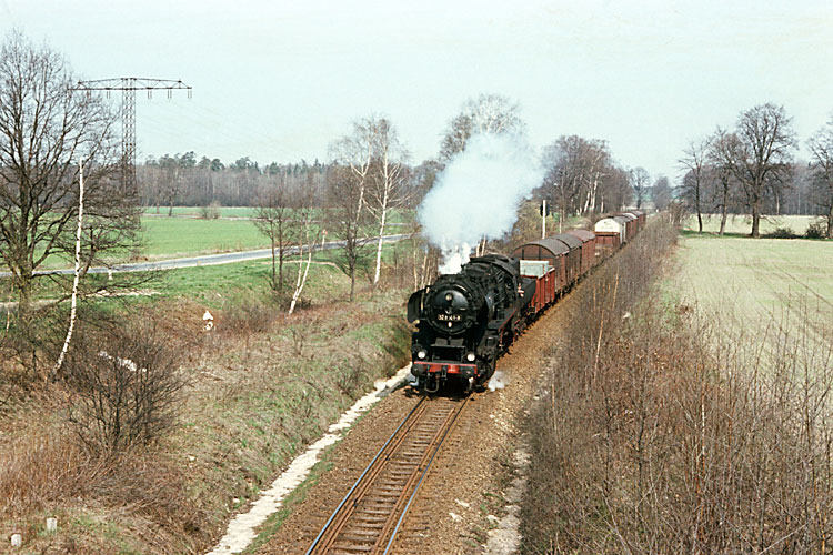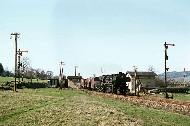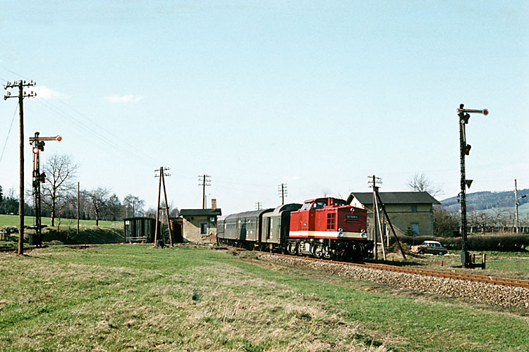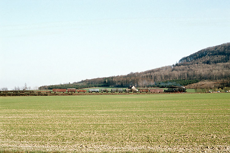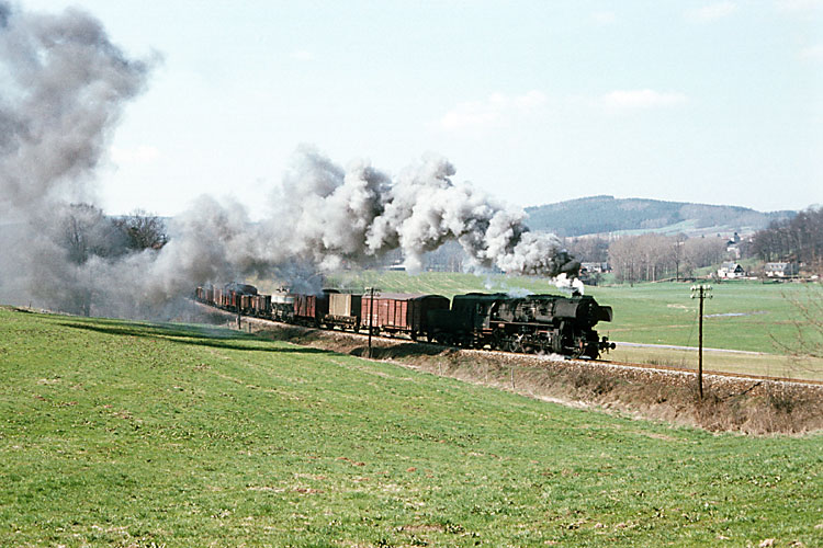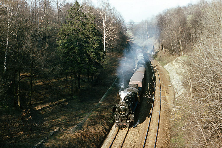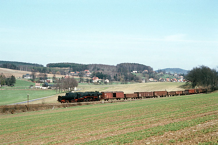 Weiter gehts bei Sohland, dem Eilzug mit der 118 folgte 52 8012 mit dem N 65277 nach Zittau, 18.04.1987. |