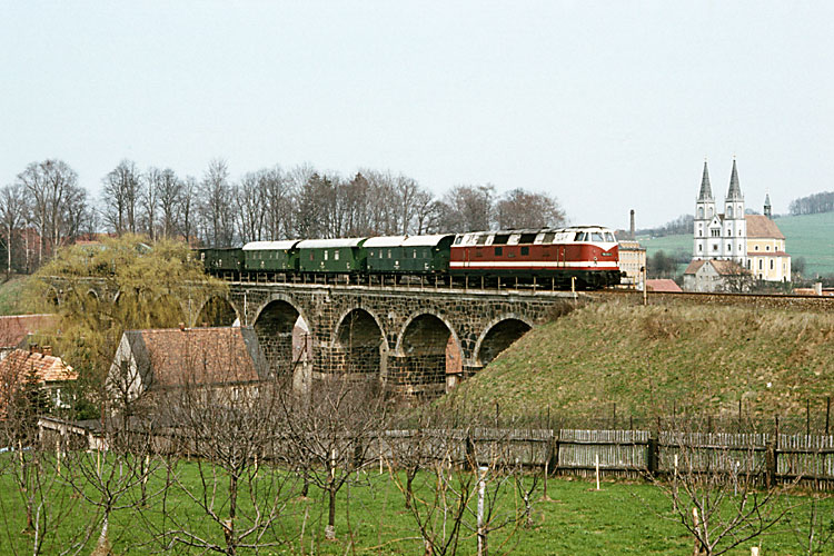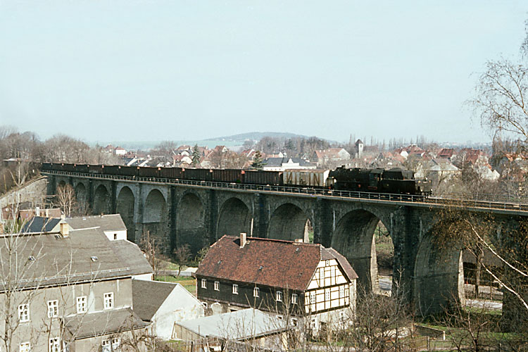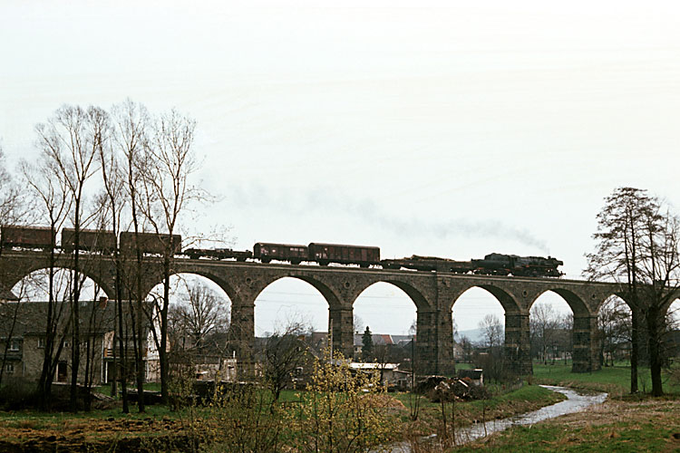 Am Morgen des Ostersonntages hatte ich mir als erstes eine Dampfaufnahme vom Viadukt in Dehmitz - Thumitz an der Strecke Dresden - Görlitz vorgenommen. Am Vormittag gab es zu jener Zeit dafür nur einen in Frage kommenden Zug, den Dg 54203 Bischofswerda - Bautzen. Bespannt mit 52 8183 von der Einsatzstelle Bischofswerda rollt dieser hier über das besagte Viadukt, 19.04.1987. |