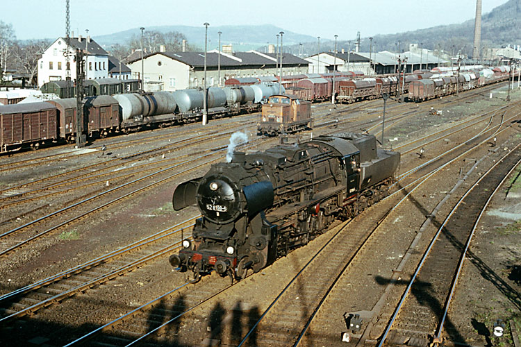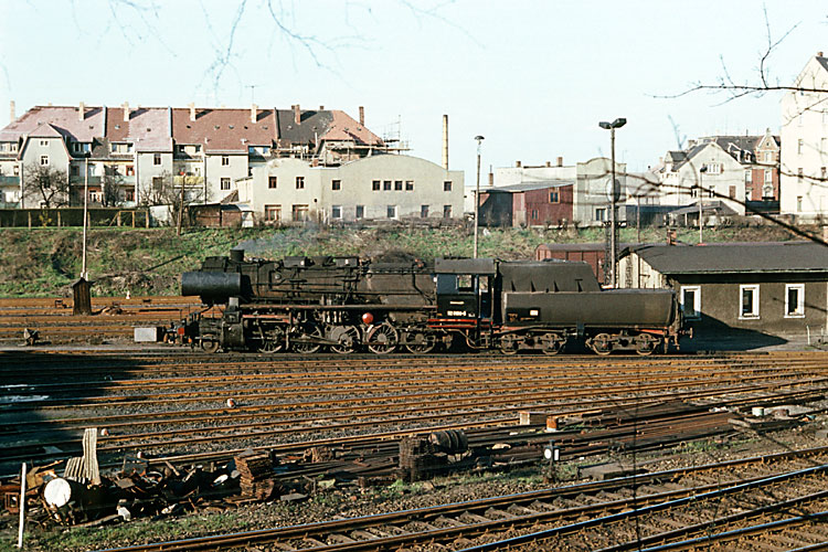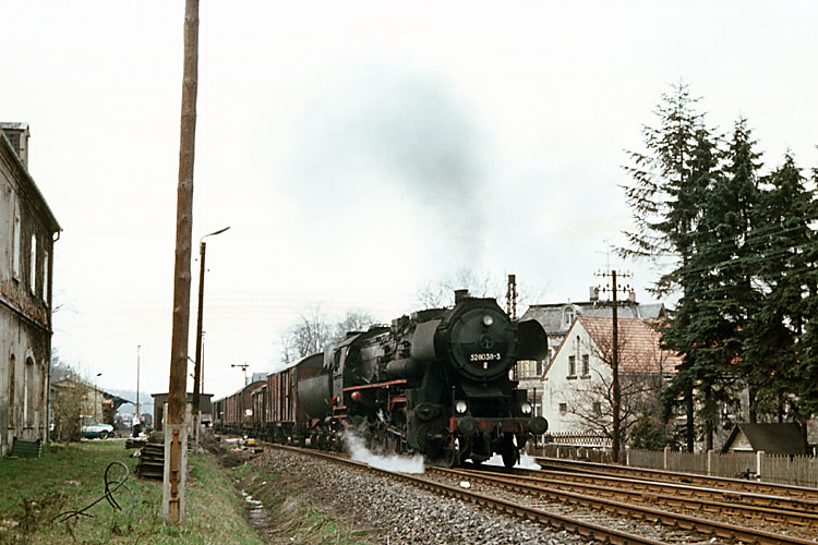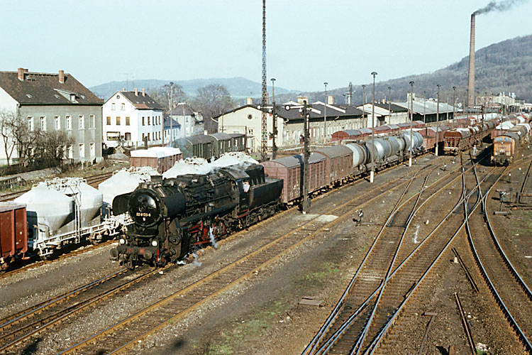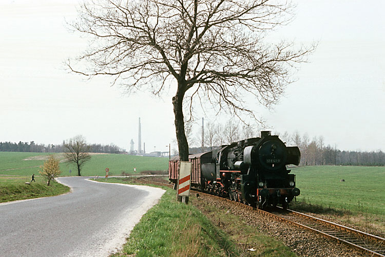 Kurze Zeit später kam 52 8149 wieder aus dem im Hintergrund zu sehenden Wetro zurück, zu erkennen auch die Schornsteine des zu bedienenden VEB Feuerfest Wetro. |