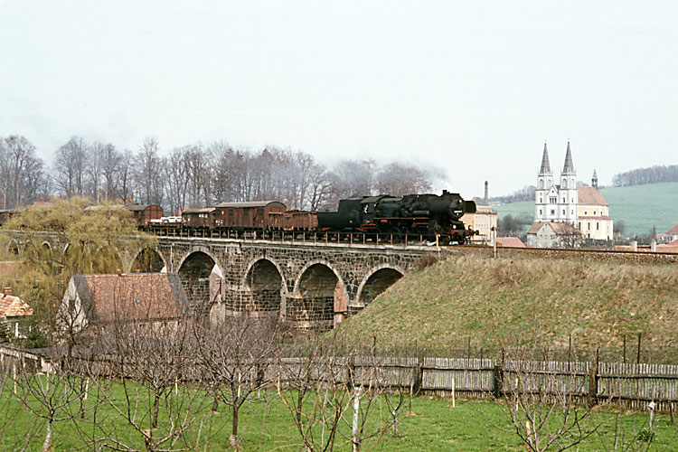 Im allerletzten Tageslicht überquerte 52 8198 mit dem N 65233 nach Herrnhut das Viadukt in Obercunnersdorf, 18.04.1987. |