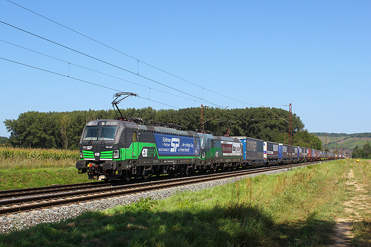 WLC 187 326 fuhr mit einem Containerzug in Richtung Würzburg. |