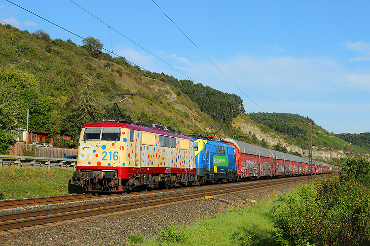 Smartrail 111 216+017 fuhren mit einem geschlossenen Autozug in Richtung Gemünden. |