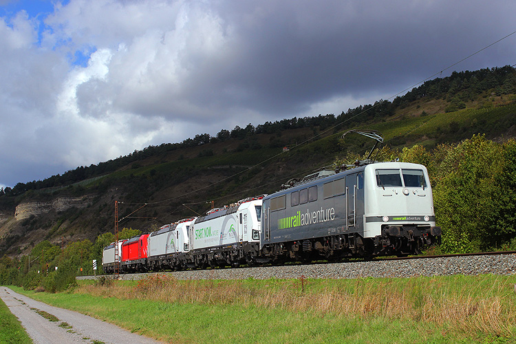 Am Nachmittag des Tages erwischte ich bei Thüngersheim eine Railadventure-Fuhre, am Haken von 111 215 hingen TXL 193 300+302, 187 172 und 193 450. Unterwegs war das Ganze als DbZ 83801 von Braunschweig nach München. |